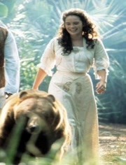 勉强及格。吉勒明的镜头稳重大气,全片在肯尼亚实景拍摄,那些做特技表演的动物是美国运过去的(目测在动物训练员的执导下,没什么伤害动物的镜头,比傻逼香港人拍的《猩猩王》强多了,当然也因为动物表演的局限,动作场面都很小儿科),一些取景非常美,纳库鲁湖的火烈鸟群、草原上变幻的云和天色,把角色往其中一摆,都是很好的桌面图。剧情可算是女版《人猿泰山》,死了父母的女主被视为部落圣女而养大,这部落所在地有矿产和医疗用土,被从美国归来遭利益腐化的王弟所觊觎,王弟阴谋杀王,携白种雇佣兵欲征服部落,所幸还有男记者阻止并和女主发展一段情,94年就编制这种围绕非洲矿产而产生的涉及高层争权的冒险故事