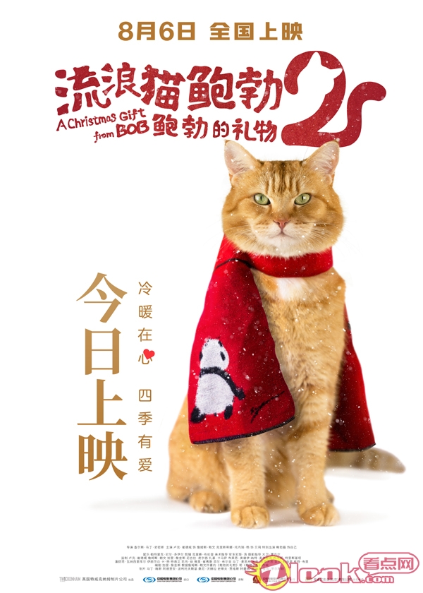 《流浪猫鲍勃》续作《流浪猫鲍勃2:鲍勃的礼物》发布上映海报,将于8月6日内地上映。上映海报中,姜黄色的鲍勃站在地上,脖子围着一条织有大熊猫图案的红色围巾,与此前预告中一位来自中国的小男孩赠送给鲍勃围巾的情节相呼应。影片的原型橘猫鲍勃于2020年6月因车祸去世,《流浪猫鲍勃2:鲍勃的礼物》也成为了它的银幕绝唱。