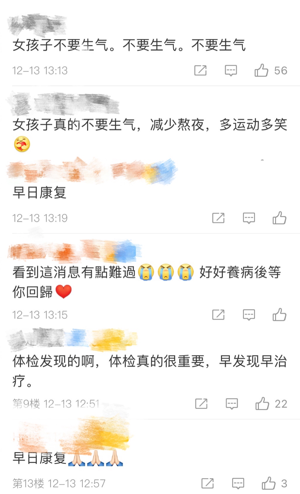 看到这一则消息的网友们在消息下面纷纷留言:“早日康复。”“看到这消息有点难过,好好养病等你回归。”“体检真的很重要,早发现早治疗。”“女孩子真的不要生气,减少熬夜,多运动多笑。”……