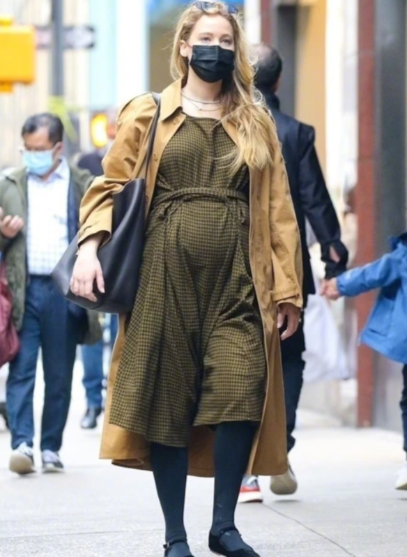 她的孕肚看起来应该有五六个月大了,凸起十分明显,也因此大表姐的穿搭非常宽松随意,绿色格纹连衣裙搭配黑色打底裤,和以往光鲜亮丽奥斯卡影后的形象还是有些差距,当妈妈实在是不容易。