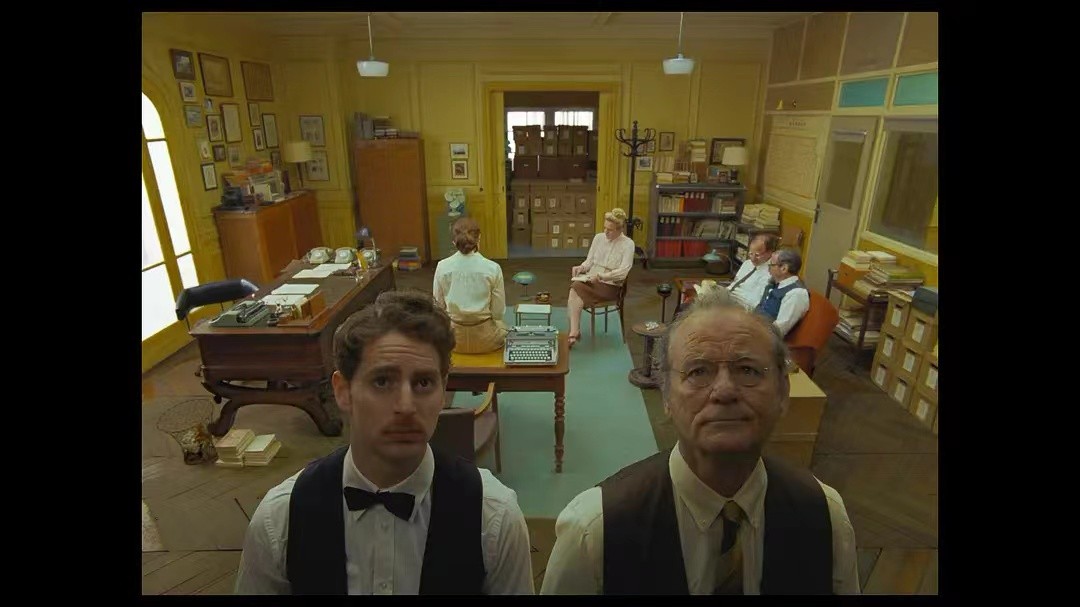 所以这部电影除了保持了韦斯·安德森一贯的对称构图和色彩的使用之外,在影像的其他使用上更加灵活多变。新闻、杂志、戏剧、舞台剧、动画等多种表现形式的杂糅,让观众目不暇接,整个空间也变得无比的灵活。