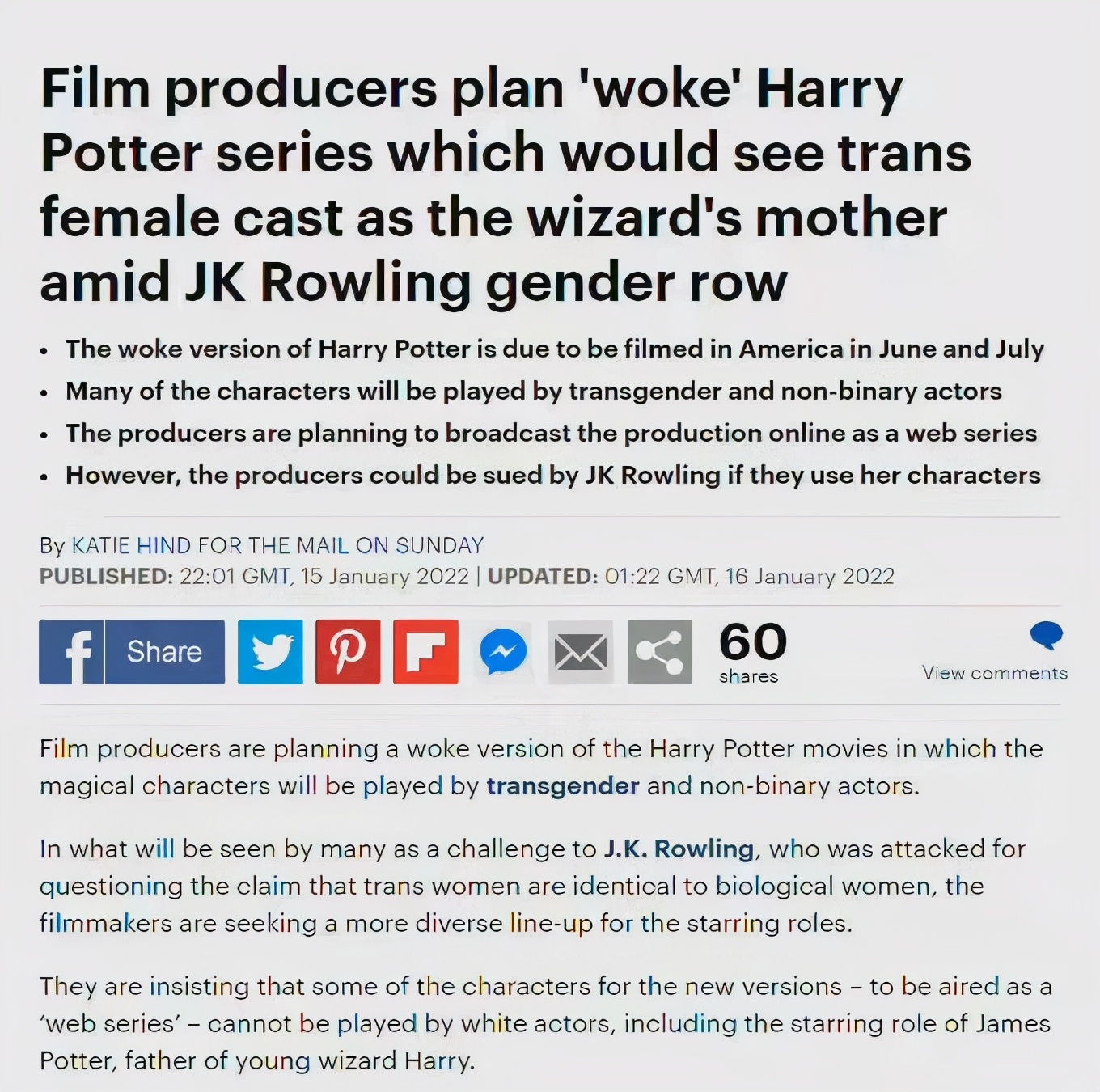 制片人目前正在筹备更加多样化的主演阵容,片中多位角色将计划由跨性别者或变性者出演。目前已经确定的哈利波特的母亲一角将由一位跨性别的女性演员来扮演。