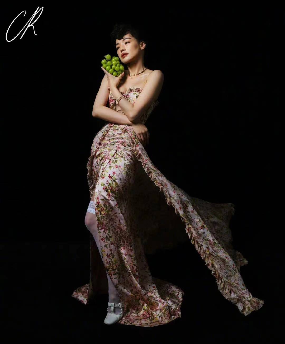 照片中的舒淇穿着碎花裙子,复古感十足。手上还拿着一串绿色的葡萄,小腿上的白色蕾丝长袜一目了然。白色小皮鞋配白色蕾丝长袜以及复古感十足的碎花长裙,舒淇整小我私家的气质都被展现出来了。