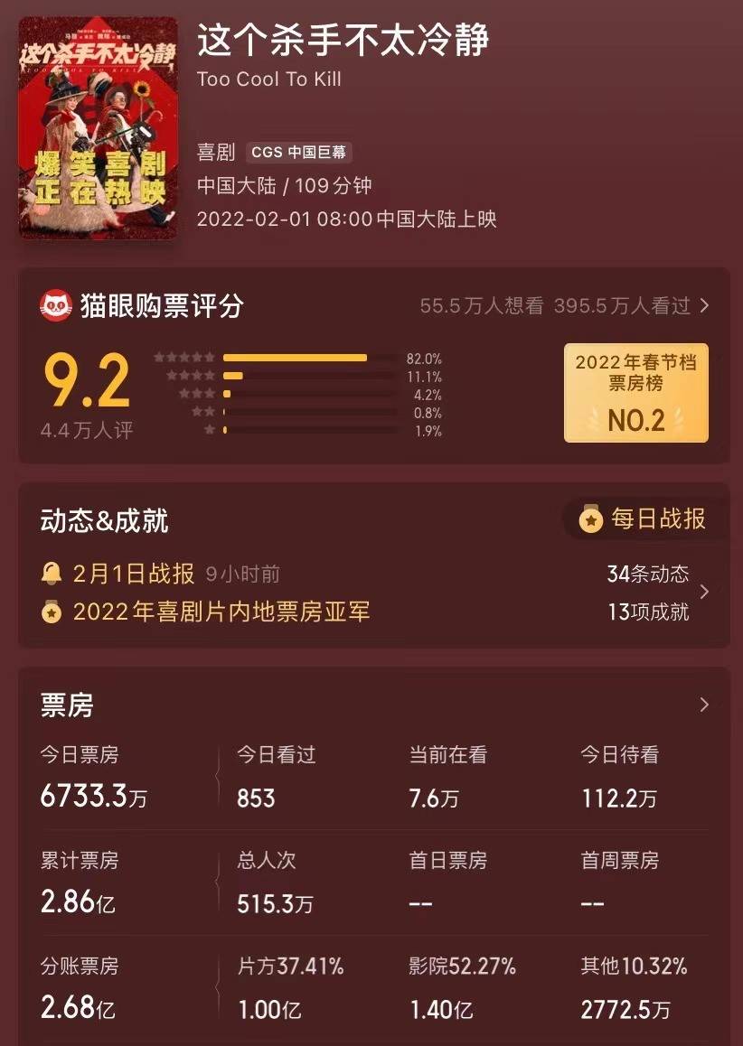 《这个杀手不太冷静》在今日实现反超,以2.86亿票房位居春节档票房第二位。电影上映11时之后迅速破2亿,在猫眼上也有着9.2分的高分,想看人数高达55.5万人。