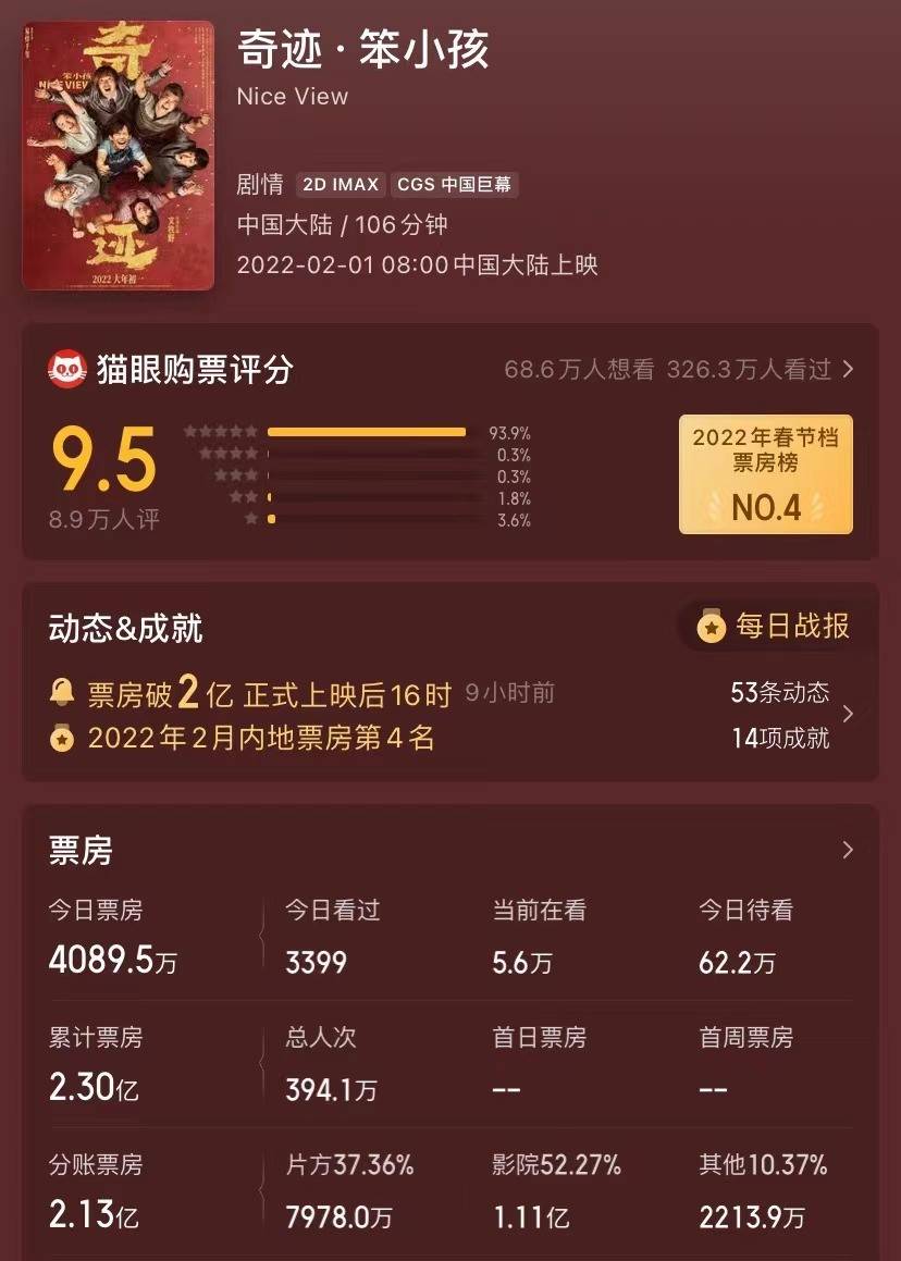 根据猫眼专业版数据显示,截止2022年2月2日8:38,春节档新片票房榜破20亿!