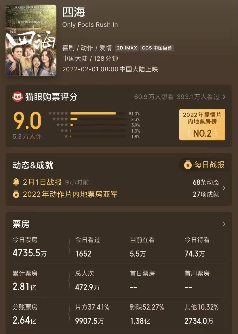 《四海》凭借2.81亿票房排名第三,影片在猫眼上的评分也高达9分。