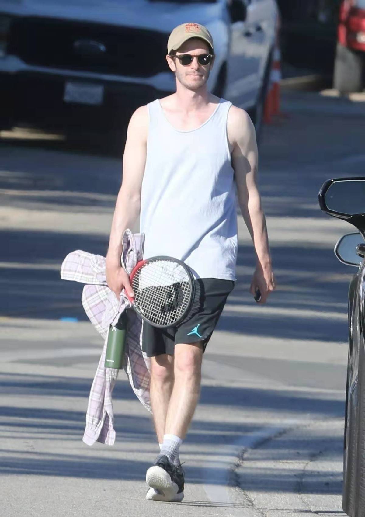照片中,安德鲁·加菲尔德一身运动装扮,头戴棒球帽,身穿简洁的白色背心和黑色短裤。他刚刚打完网球,手里拿着网球拍和水壶。不久后加菲脱下衬衫,秀出双臂肌肉,丝毫不畏寒冷天气,让人看了怀疑不在同一个季节。