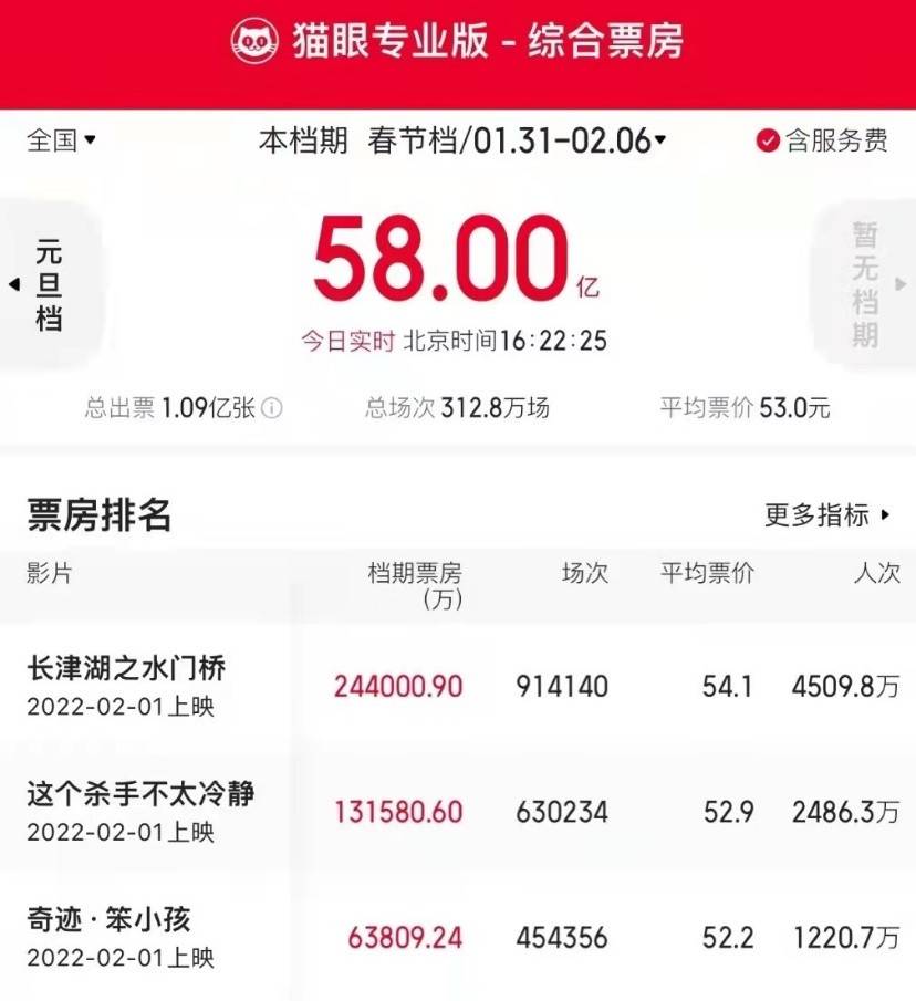 根据猫眼专业版数据,截至2月6日16点22分,春节档总票房已突破58亿。但是近年,春节档的票价是愈来愈贵,今年的票价更是堪称史上最贵,目前平均票价为52.9元。于是,从大岁首年月一到初三,进电影院的人愈来愈少,只有《狙击手》连气儿三天实现逆跌。