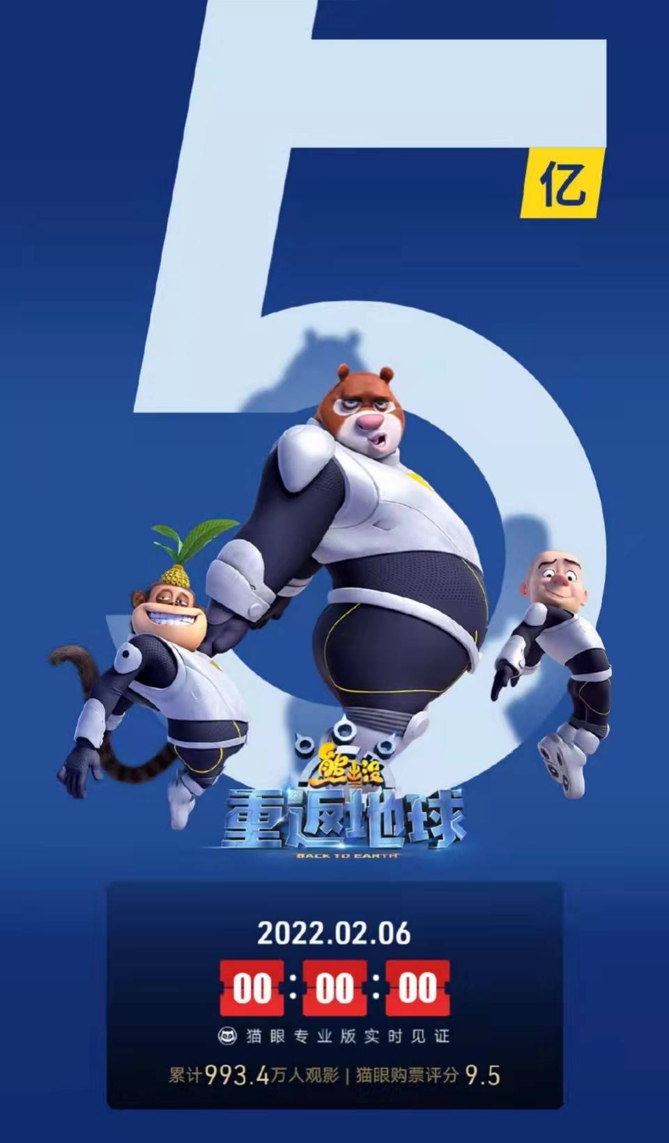 第四名《熊出没·重返地球》突破5亿,不仅成为2022年度春节档动画电影冠军,更突破中国影史上春节档动画档期票房纪录!这部作品在经典IP熊出没系列的根蒂根基上做出突破,以硬核科幻题材带来全新故事,诚意满满的制作获得大小朋友的一致喜爱。喜欢动画和科幻电影的观众一定不要错过!