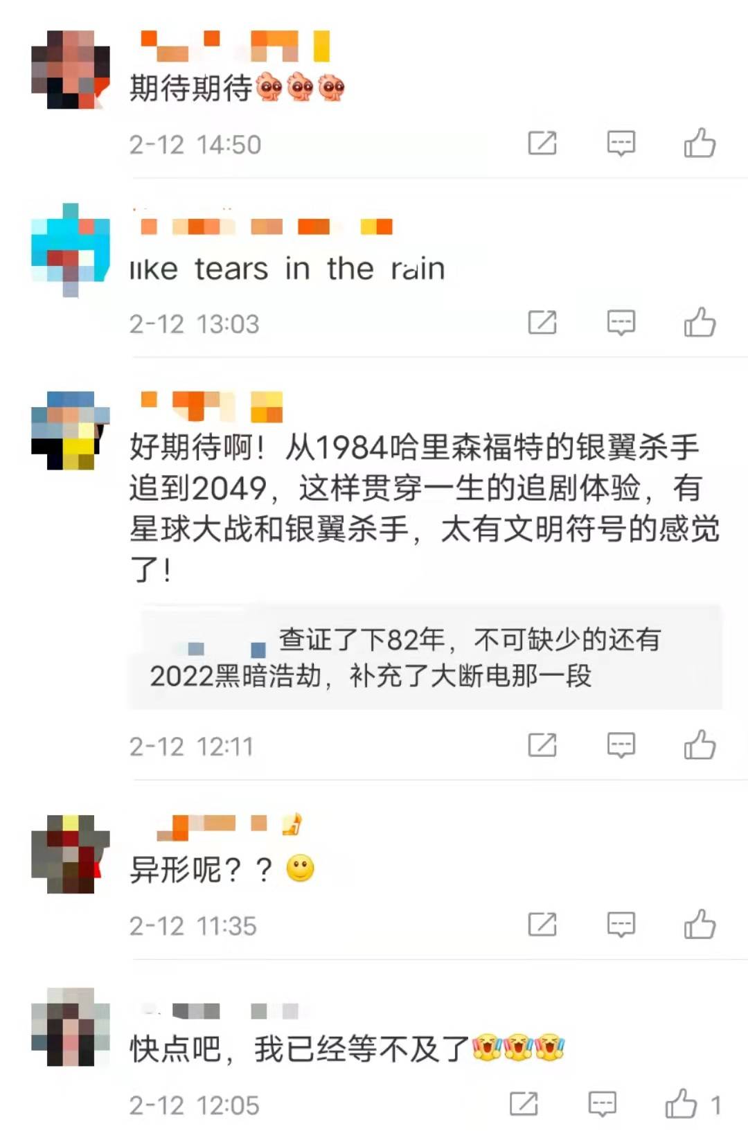 此消息一出便收获了大批网友们的关注,纷纷留言希望电影拍摄可以早日提上日程,“搞快点!”“已经等不及了”!可见网友们对电影《银翼杀手》系列的喜爱之情已经溢于言表。