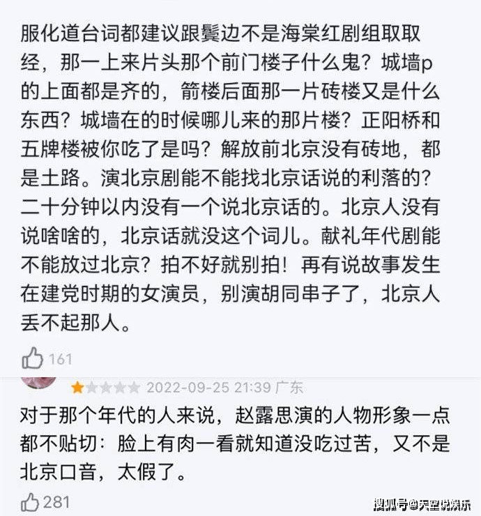 第一篇章中是讲1950年故事,从解放初期到改革开放时期,有北京网友评论,服化道台词建议和《鬓边不是海棠红》剧组取经,城墙上面都是P齐的,正阳楼和五牌楼不见了,解放前北京没有砖地,都是土路。最后还指出,再有说故事发生在建党时期的女演员,别演胡同串子了,北京人丢不起那人。
