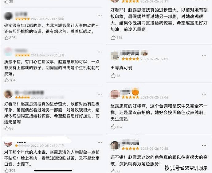 有的则评价赵露思演技有进步,对她改观很大,希望好好加油,前途无量。夸赵露思演的好,田枣是个生意盎然的虎妞,很灵动,收视率破1.6,也太猛了。甚至有的觉得赵露思红,出演正剧被被黑,惹人酸了。其实,赵露思还是有点演技的,但还需要多多磨练下演技。