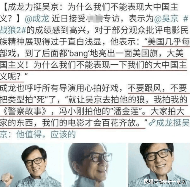 在很多人看来,吴京拍电影不要命的劲颇有几分像当年的成龙。而成龙也透露表现了对于这部电影的高度认可,这部戏很好的宣传了爱国主义,但是他也透露表现这类电影最好不要跟风,究竟结果每一个人喜欢和擅长的领域不同,所以免盲目随从跟随,专注于自己喜欢的事情就好。然而并非所有人都可以或许将成龙的这番话听到心里去。很多人在看到这类电影有利可图之后便打起了模仿的设法主意。
