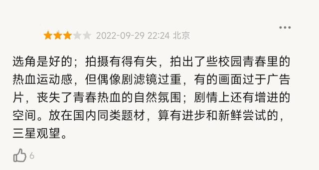 选角是好的;拍摄有得有失,拍出了些校园青春里的热血运动感,但偶像剧滤镜过重,有的画面过于广告片,丧失了青春热血的自然氛围;剧情上还有增进的空间…算有进步和新鲜尝试的…