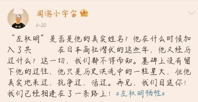 周游:左秋明是否是他的真实姓名?他在什么时候加入我方?在日本商社潜伏的这些年,他又经历过什么?这一切,我们都不得而知。墓碑上没有留下他的过往,他只是历史洪流中的一粒星火,但他真实地来过,抗争过,活过…