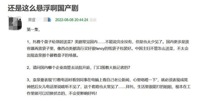 1,托着个盘子给邻居送菜?美剧常见,国内不能说完全没有,但是也太少见了。国内更多是放容器再放袋子里,像西点类都流行买好很fancy的纸袋子包装好。中国主妇不管怎么送菜,不太会出现袁泉那个托着盘子的场景。