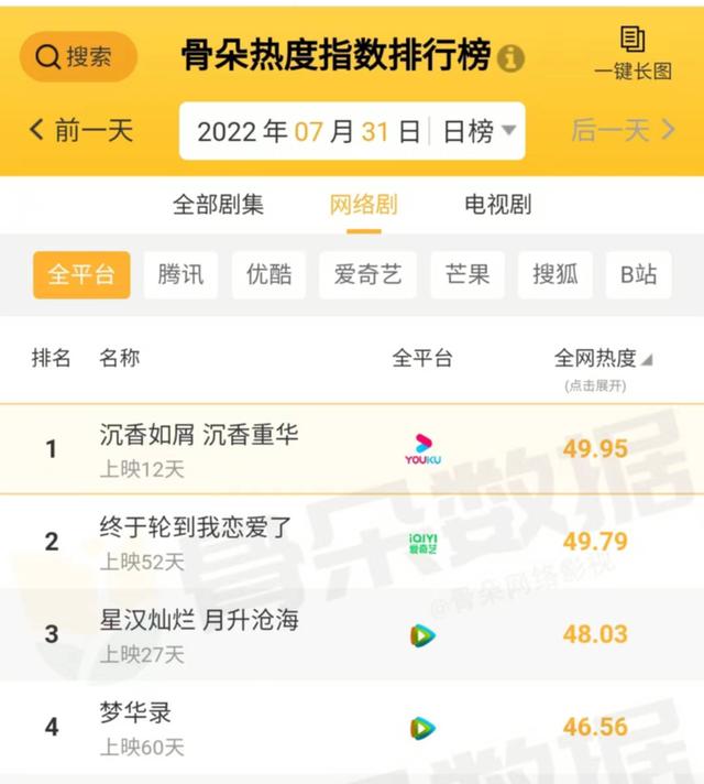 吐槽归吐槽,但《沉香如屑》在各大榜单成绩亮眼,在灯塔专业版、猫眼全网热度榜、骨朵剧集排行榜、艾漫在播剧角色热度、数据视界电视剧热度指数等等,都排在了第一。