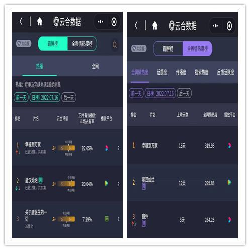 云合数据显示,无论是霸屏榜,还是全舆情热度榜,《幸福到万家》都排在首位,紧随其后的是吴磊和赵露思主演的《星汉灿烂》。