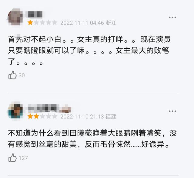 但是,从观众的评论来看,要让我们失望了,女主眨眼当补帧,咧嘴当表情;现在的演员只要瞎瞪眼就可以了;睁大眼睛,咧着嘴笑等等的评论比比皆是,着实让人看不下去。