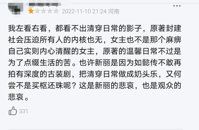 这让原著粉丝大为失望,完全没了原著的经典,也看不出清穿日常的影子,封建社会压迫的内核也全都没有了。魔改后的《卿卿日常》就像一群现代人穿着古装在演恋爱综艺,违和感太强了。