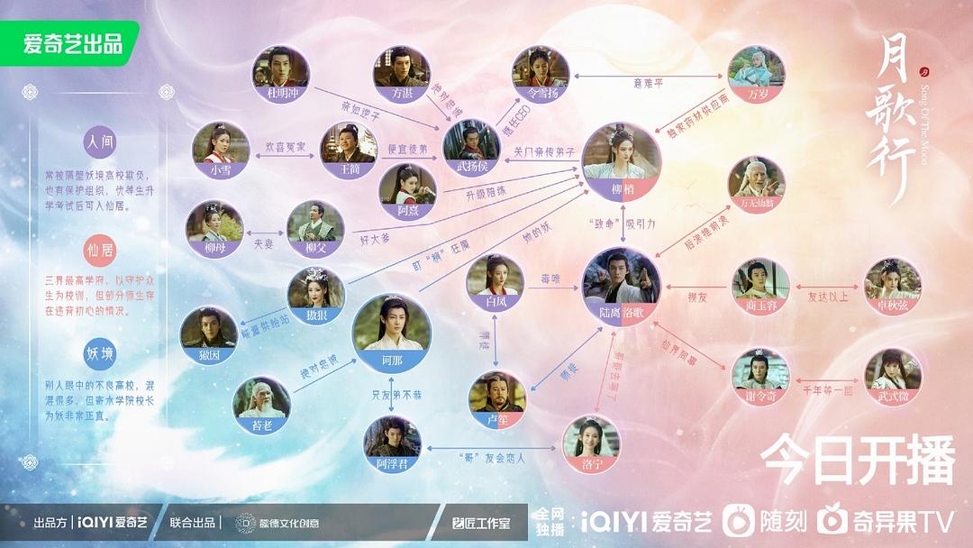 相较于剧情的中规中矩,这部剧的角色关系和人物群像到是十分精彩。官方甚至怕我们看不懂提前帮我们做好了人物关系图,并且贴心附上了仙居、人间、妖境的背景介绍:
