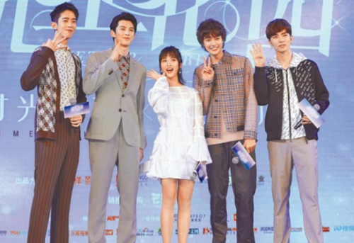 新F4与杉菜首度同台表态。左起梁靖康、王鹤棣、沈月、官鸿、吴希泽。